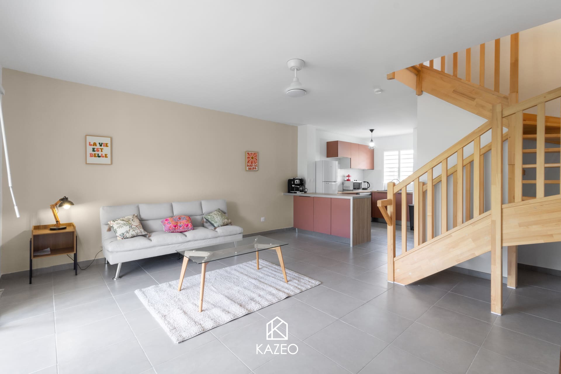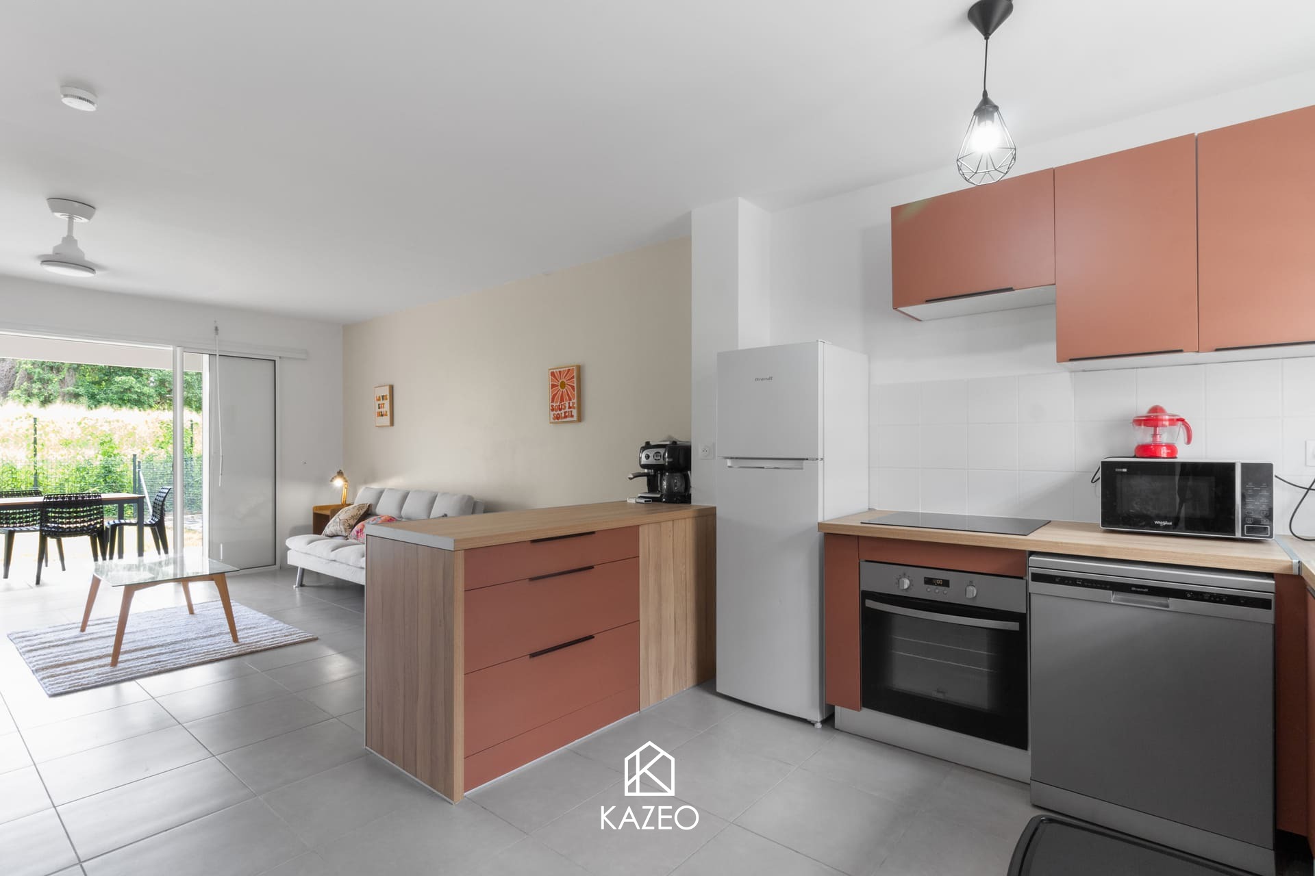 L’appartement se compose, au rez-de-chaussée, d’un séjour lumineux avec cuisine ouverte entièrement équipée, d’un WC indépendant, d’une buanderie (lave-linge, sèche-linge) et d’un accès direct au jardin. À l’étage, vous trouverez deux chambres climatisées et une salle d’eau avec WC. Deux places de parking privatives complètent ce bien.