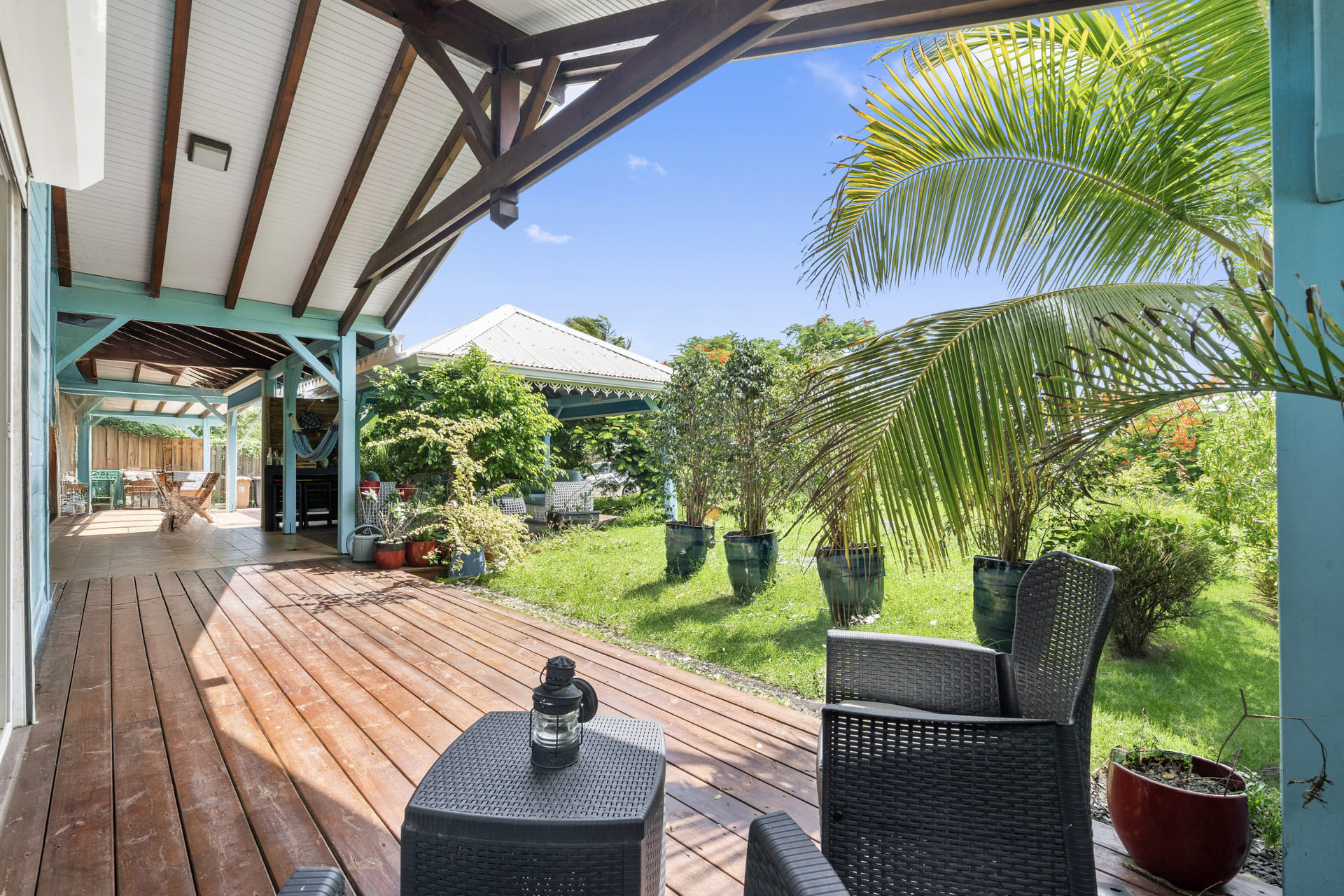 Son extérieur soigné comprend une terrasse couverte et un carbet pour des moments de détente en plein air. Moderne et écoresponsable, la villa fonctionne en autonomie grâce à un système solaire et un groupe électrogène, sans raccordement au réseau EDF. Reliée au tout-à-l’égout et dotée d’un chauffe-eau solaire, elle assure un confort optimal.