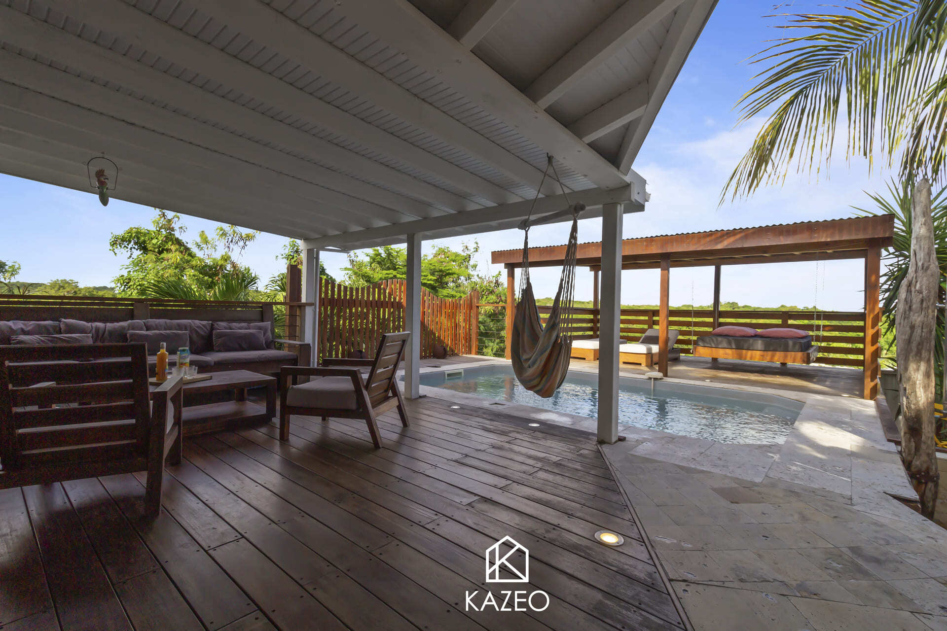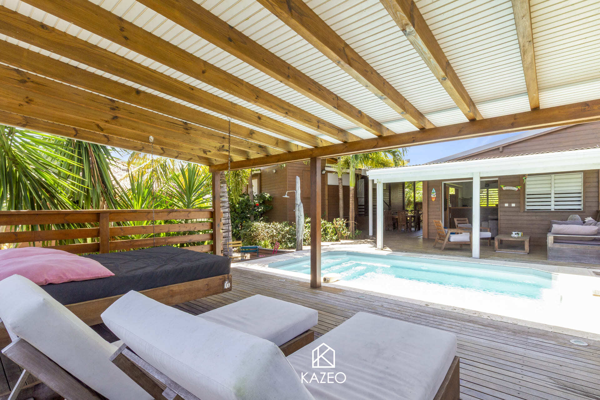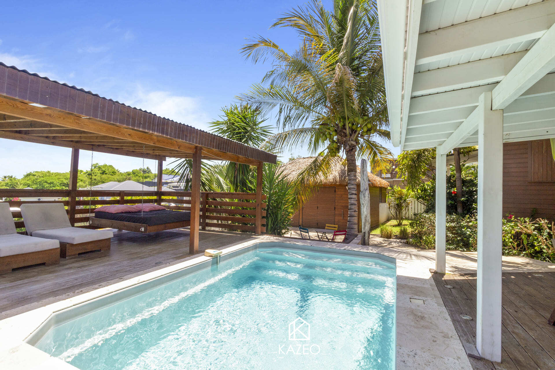 À vendre à Saint-François en Guadeloupe, découvrez la Villa Madera, une propriété atypique nichée dans un cadre verdoyant à seulement 500 m à pied de la plage de l’Anse à la Barque. Cette villa de charme offre 3 chambres avec leurs salles d’eau privatives, un WC invité, ainsi qu’un agréable espace de vie tourné vers l’extérieur. Vous apprécierez sa piscine au sel 4x2m, son portail électrique, son parking, et l’ambiance coup de cœur qu’elle dégage.Un atelier et un garage aménagé avec petite cuisine complètent le bien, parfaits pour créer un studio indépendant destiné à la location ou pour accueillir famille et amis. La Villa Madera représente une opportunité rare alliant confort, authenticité et emplacement privilégié au cœur de Saint-François.